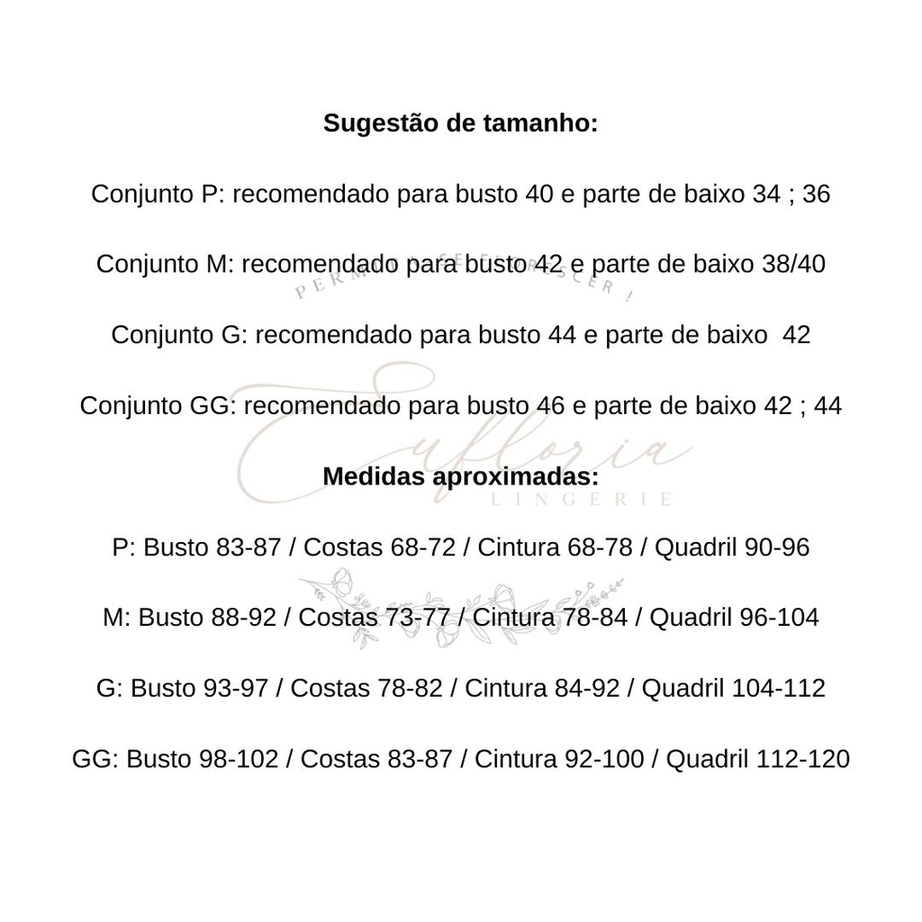 Recomendamos para tamanho P busto 40 e quadril 34/36, M busto 42 e quadril 38/40, G busto 44 e quadril 42, GG para busto 46 e quadril 44 - VEJA A TABELA DE MEDIDAS