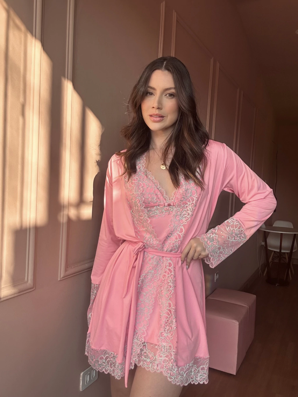 Todo em malha fria e uma renda super sofistica o robe milca traz todo o requinte que você precisa para estar luxuosa e bem arrumada na hora de dormir, sem contar que é uma ótima pedida para fazer aquele suspense na lingerie que é mais uma maneira de usar. Com a camisola Milca na mesma renda também fica uma composição perfeita!